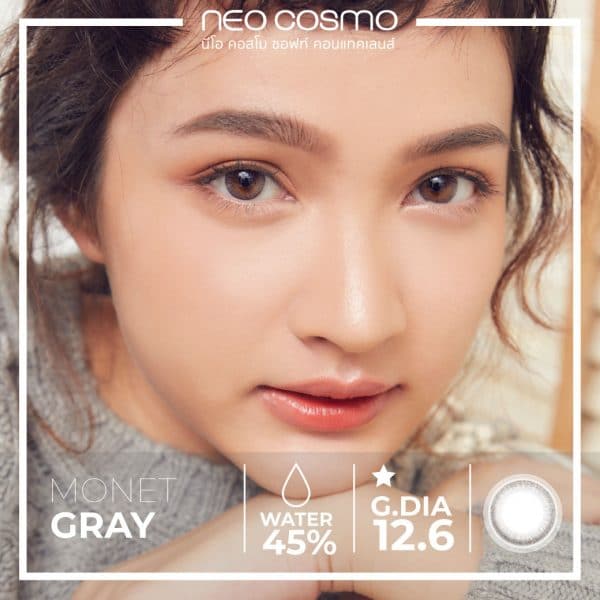 Neo Cosmo ‘Monet Gray’ คอนแทคเลนส์สีเทากับขนาดลายเล็กๆเท่ากับตาดำปกติ ที่ดูตัวเลนส์แว่บแรกอาจจะรู้สึกธรรมด๊าธรรมดา แต่ใส่แล้วไม่ธรรมดา เพียงเพิ่มสีเทาบางๆที่ขอบตา ก็เปลี่ยนลุคจากสาวเรียบร้อย เป็นสาวมั่น ทันสมัยขึ้นในพริบตา!
